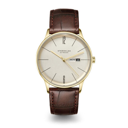 Tarcza jest ograniczona do podstawowych elementów, ale oferuje wyświetlanie daty i dni tygodnia (w języku niemieckim). Pasek wykonany ze skóry bydlęcej posiada szlachetny nadruk aligatora, który sprawia, że model będzie przyciągał wzrok na nadgarstku.